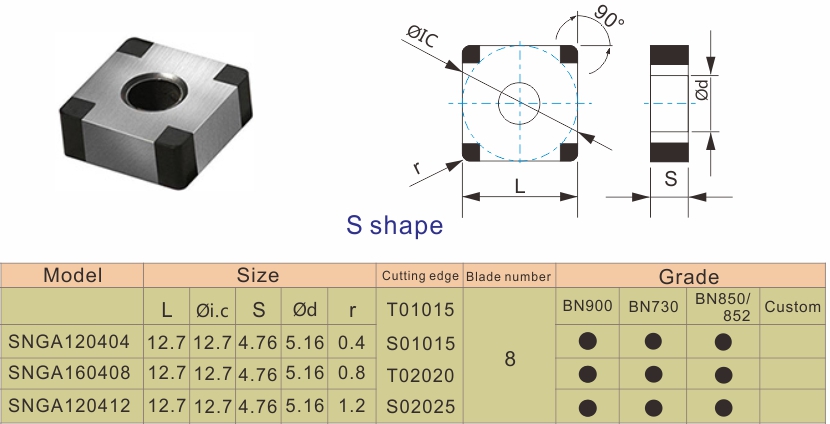 The SNGA series cubic boron nitride cutter is mainly used for machining parts of cast iron, quenching steel and high manganese steel.